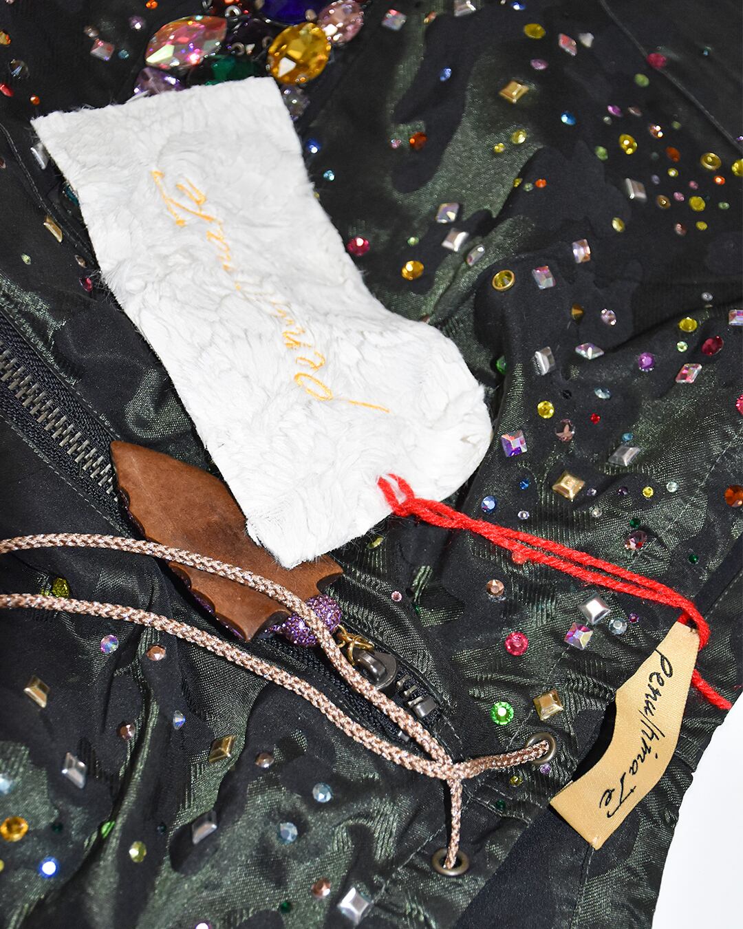 PENULTIMATESS25のコンセプトは“庄周梦蝶”荘州は自分が蝶になる夢を見た、荘州は目を覚まし、自問自答する。自分が蝶になったのか、それとも蝶が自分になったのか。夢は現実のようにリアルで、現実は夢へと変化する。SS25は、物語に混沌としたロマンスを誘う。空でも海底でも、ダイヤモンドを宿した蝶が浜辺の貝殻と混ざり合い、光視症のような光景を描き出す。トップスには350匹の蝶がビーズで飾られ、スカートには巨大な手編み模様が幻想的に織り込まれている。輝く貝殻の龍が、お守りのようにラインの先まで舞い上がる。夢を語る者にとって、真実であろうとなかろうと、何も変わらない。すべてが一体となっている。