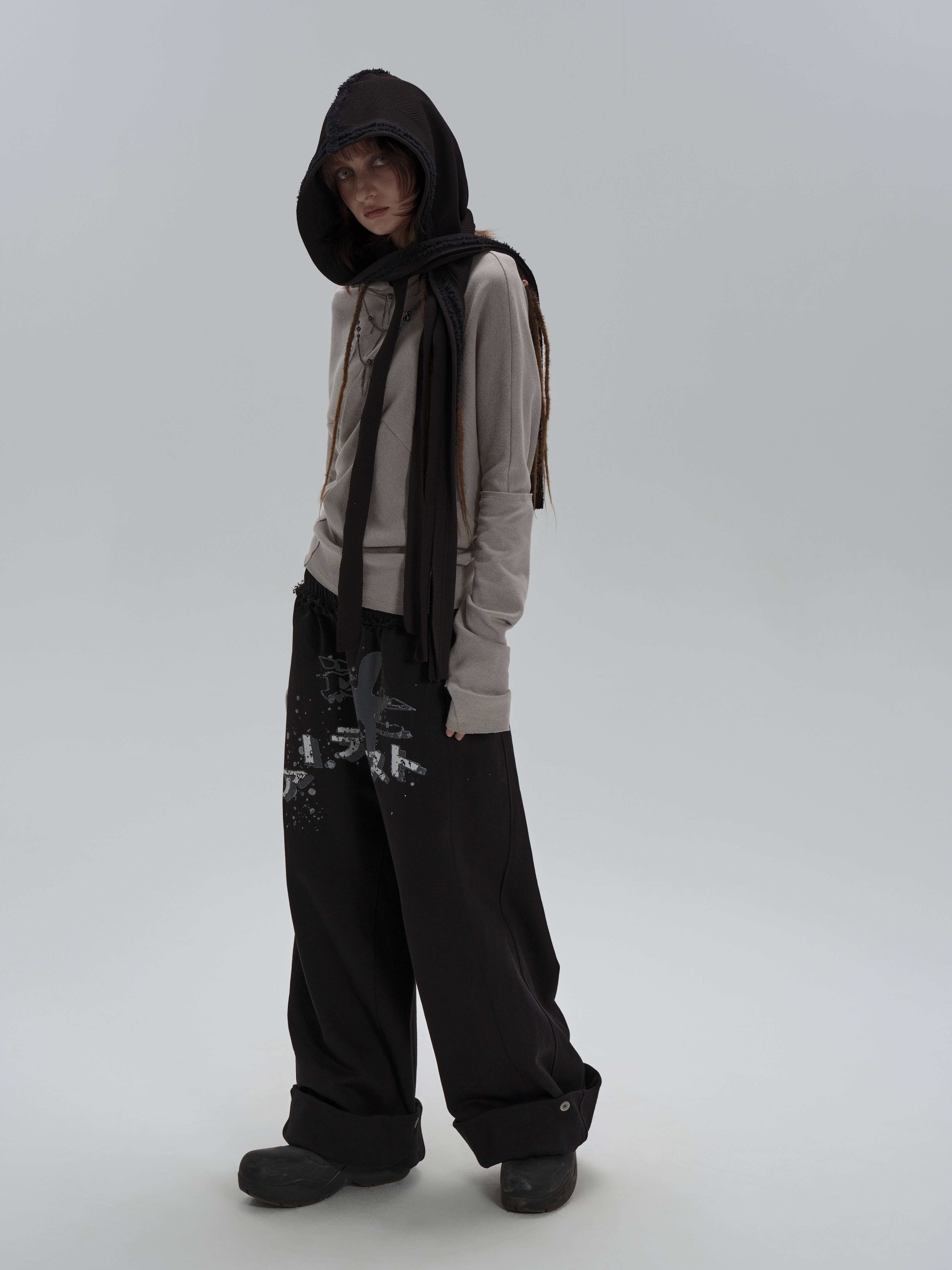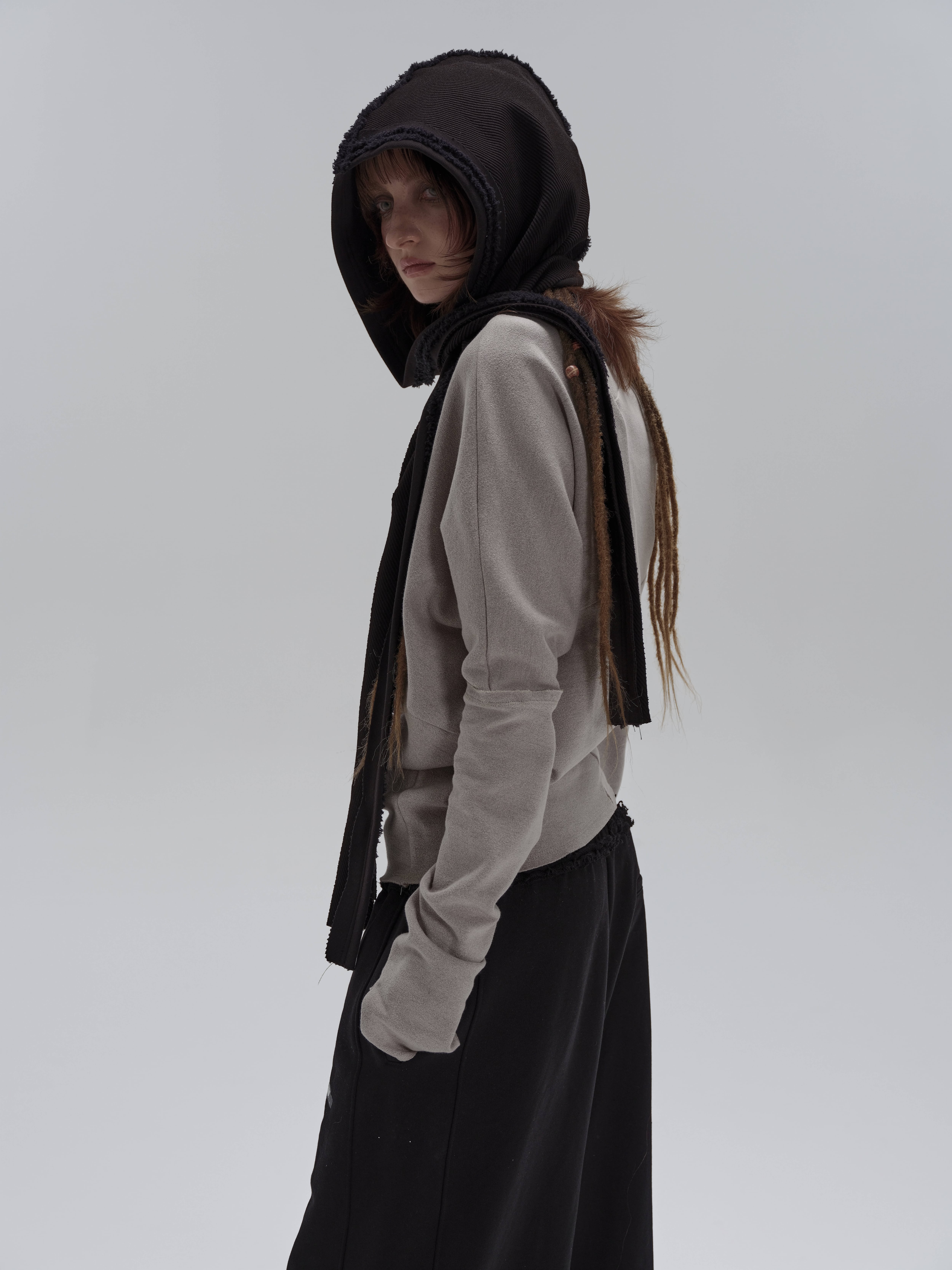 このスカーフフードは、古代の編み込みヘッドピースからインスピレーションを得ており、グランジのアンチファッション美学を体現しています。