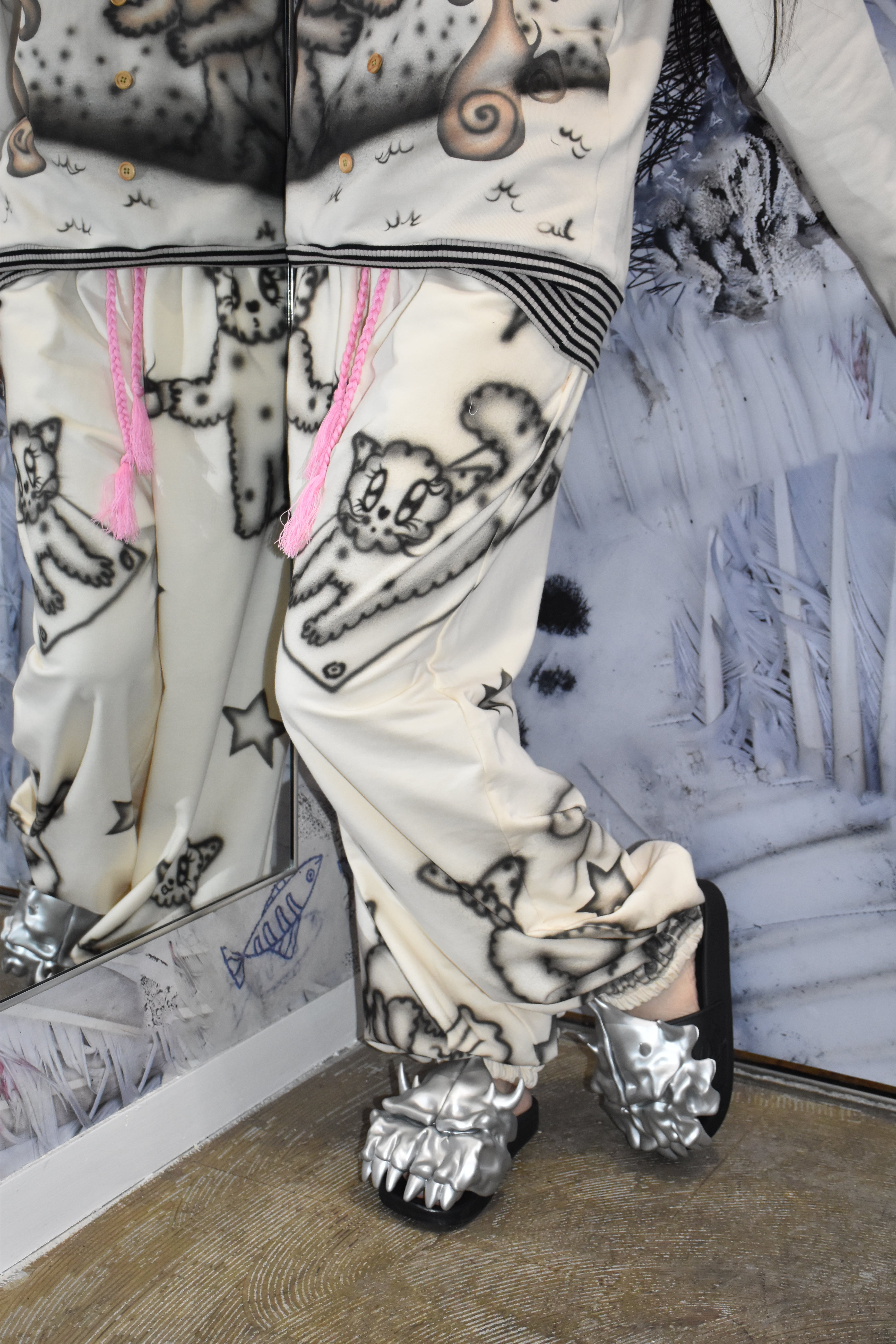 Auntie Poonsは、タイ生まれの地域に根ざしたアートウェアブランドです。糸、生地、そして記憶を通して、その魅力を語りかけます。タイの伝統とモダンで混沌としたエレガンスを融合させています。一つ一つの服はエアブラシで手作業で描かれ、愛情を込めて縫い上げられています。その縫製には、幼少期の記憶や個人的な物語、そして愛猫との静かな友情さえも彷彿とさせるものがあります。