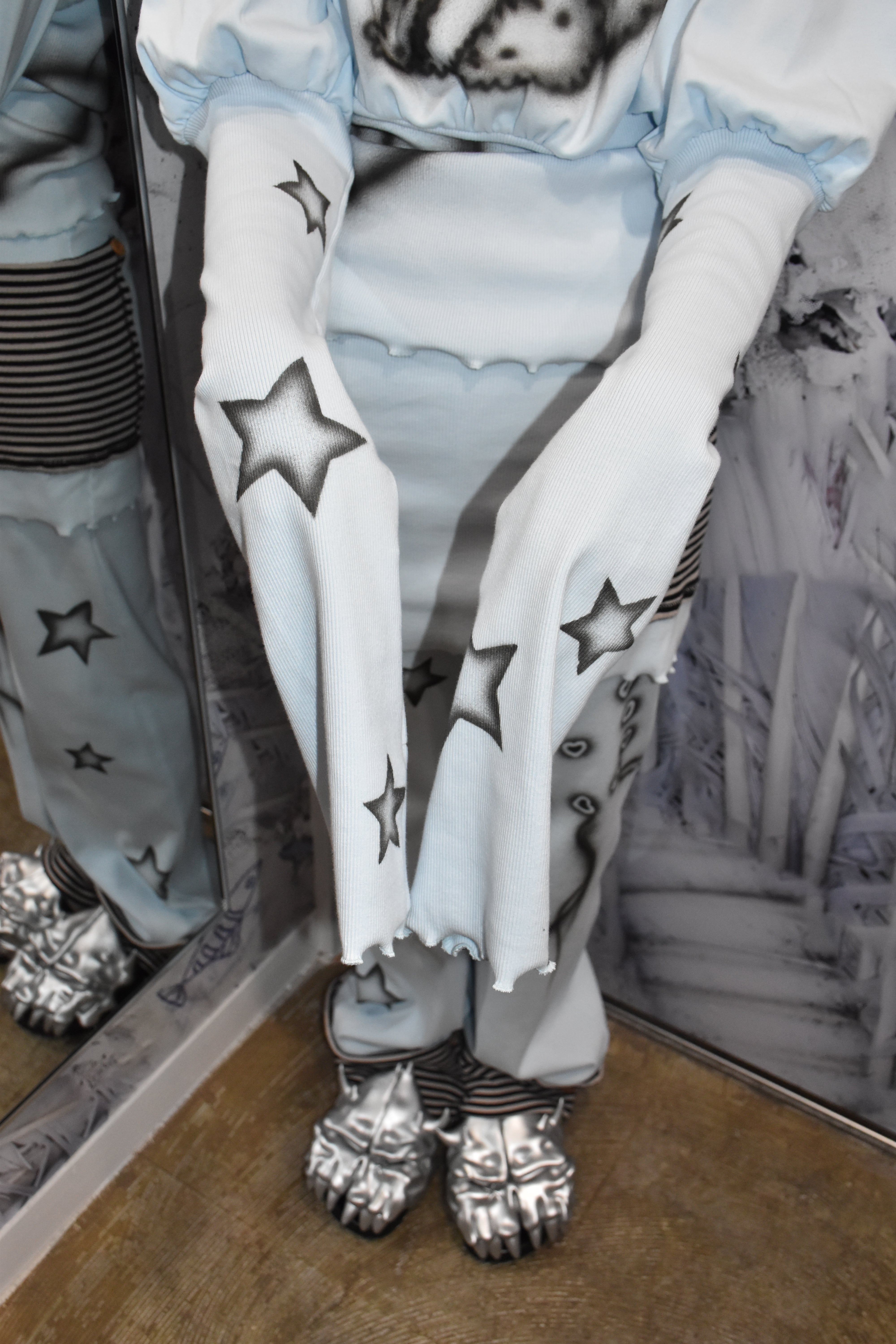 Auntie Poonsは、タイ生まれの地域に根ざしたアートウェアブランドです。糸、生地、そして記憶を通して、その魅力を語りかけます。タイの伝統とモダンで混沌としたエレガンスを融合させています。一つ一つの服はエアブラシで手作業で描かれ、愛情を込めて縫い上げられています。その縫製には、幼少期の記憶や個人的な物語、そして愛猫との静かな友情さえも彷彿とさせるものがあります。