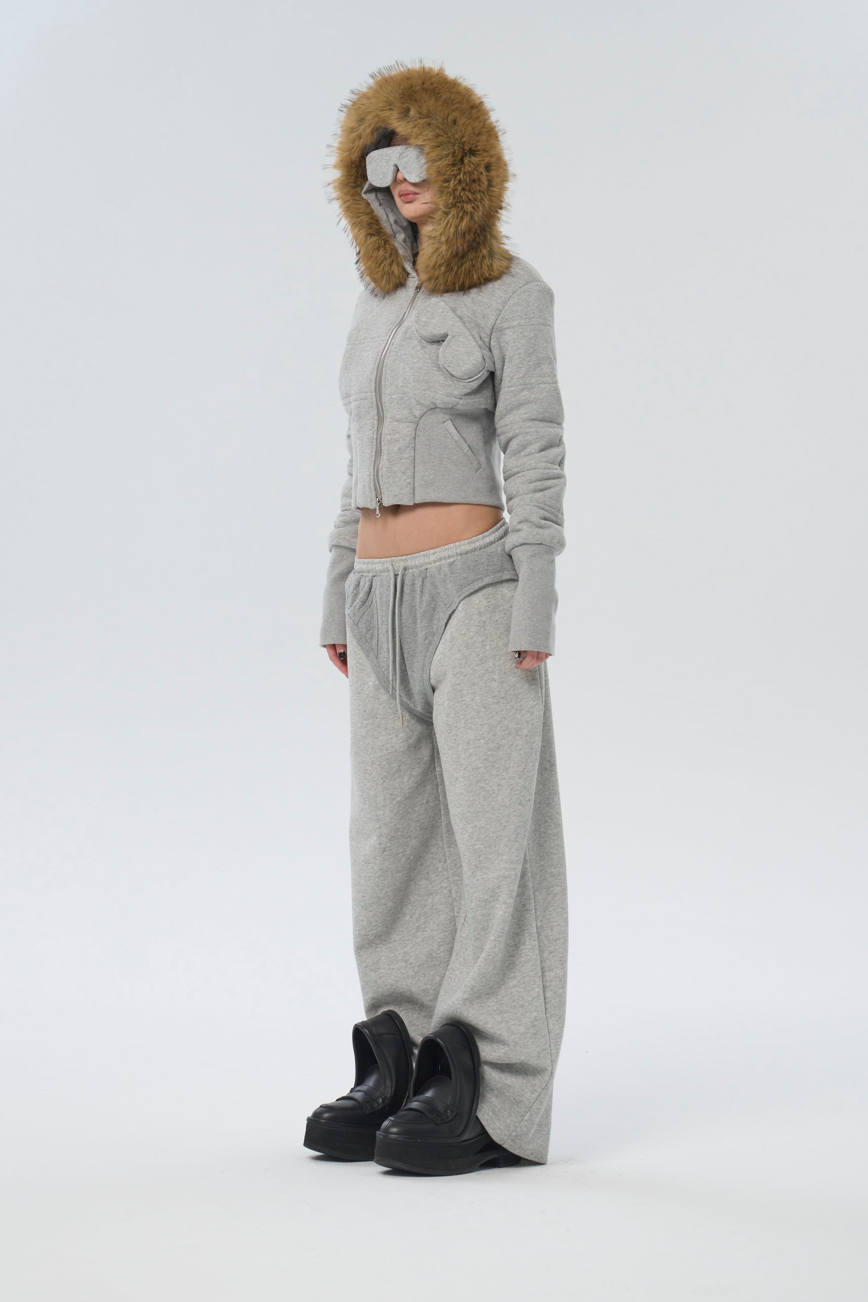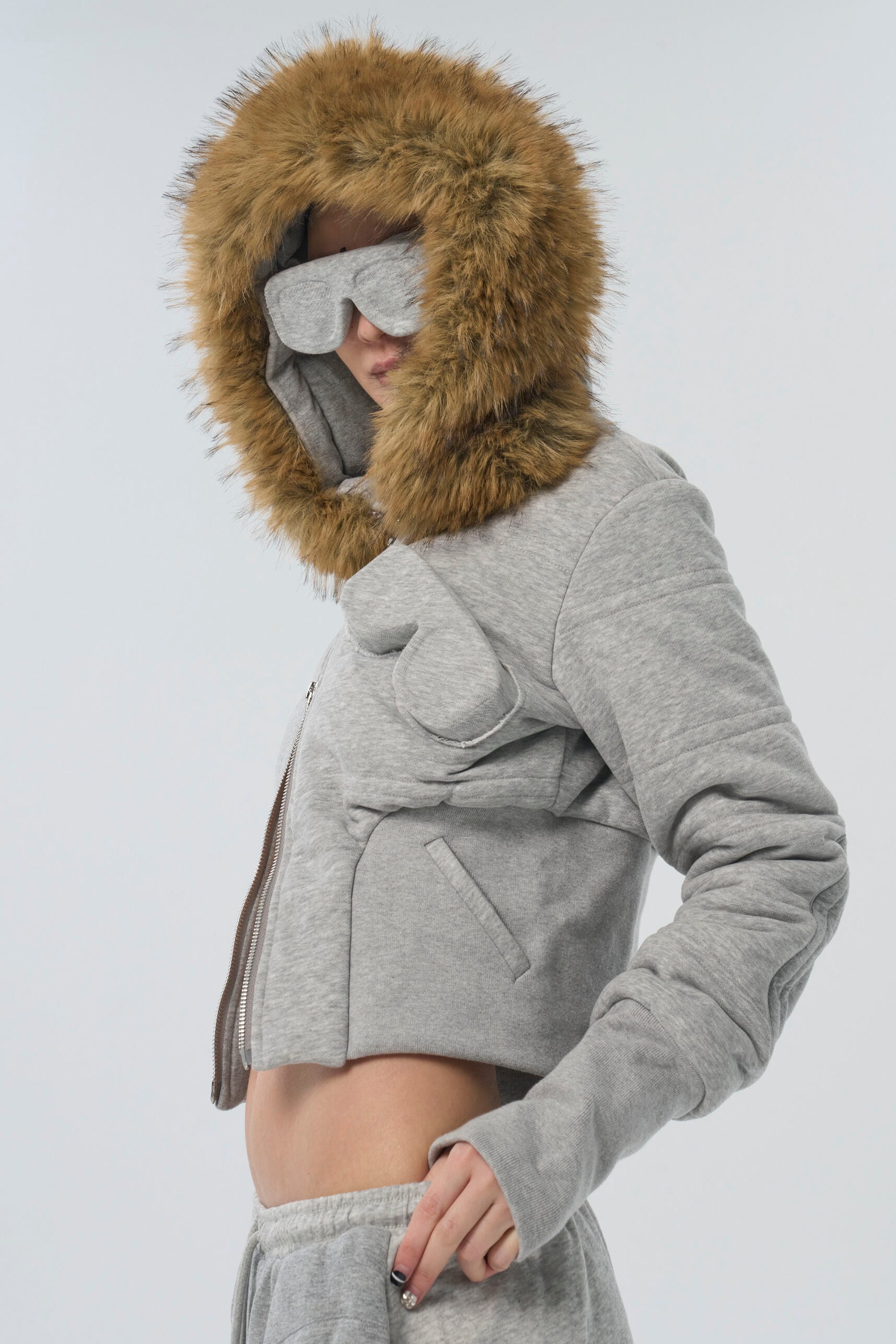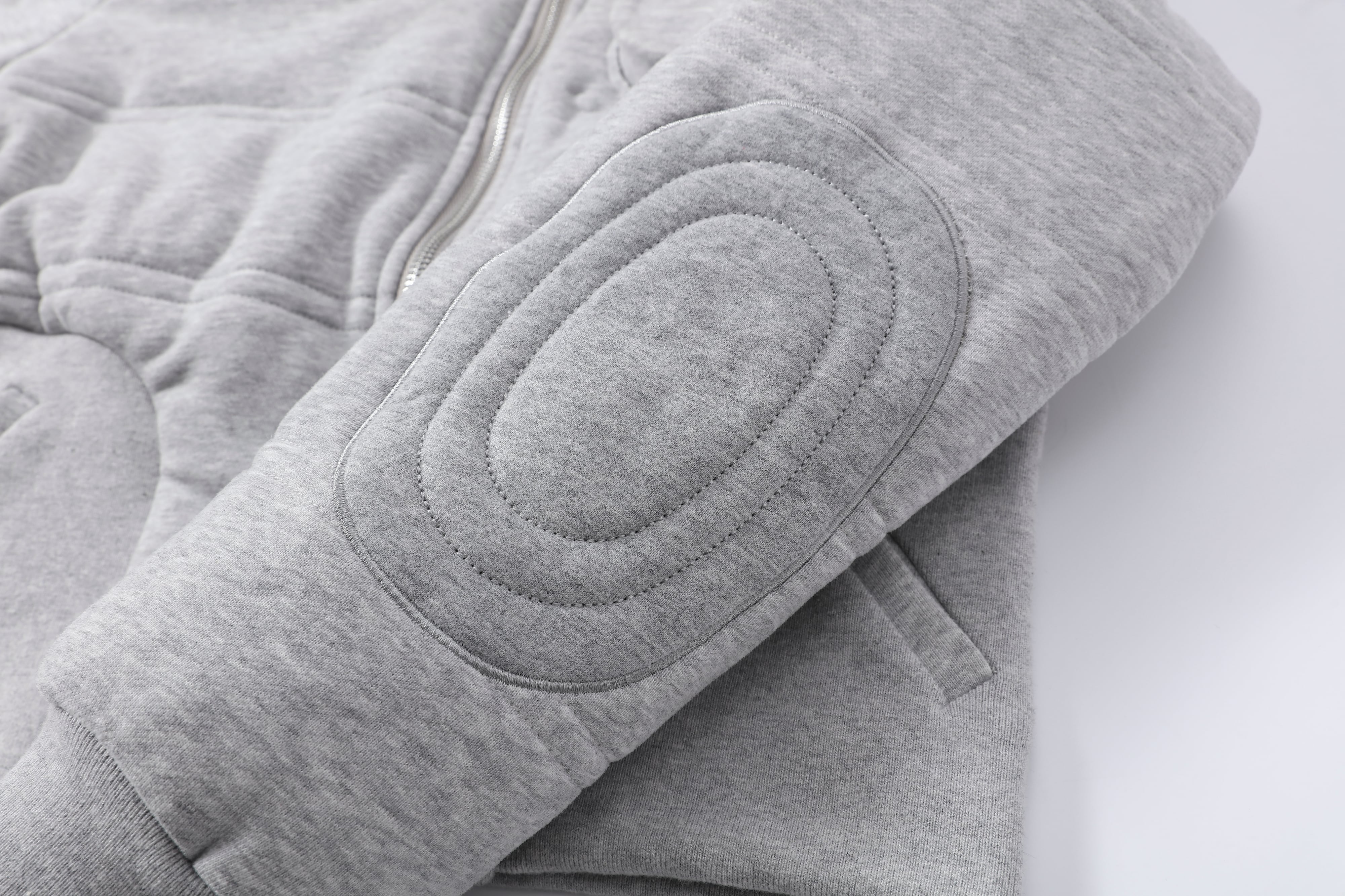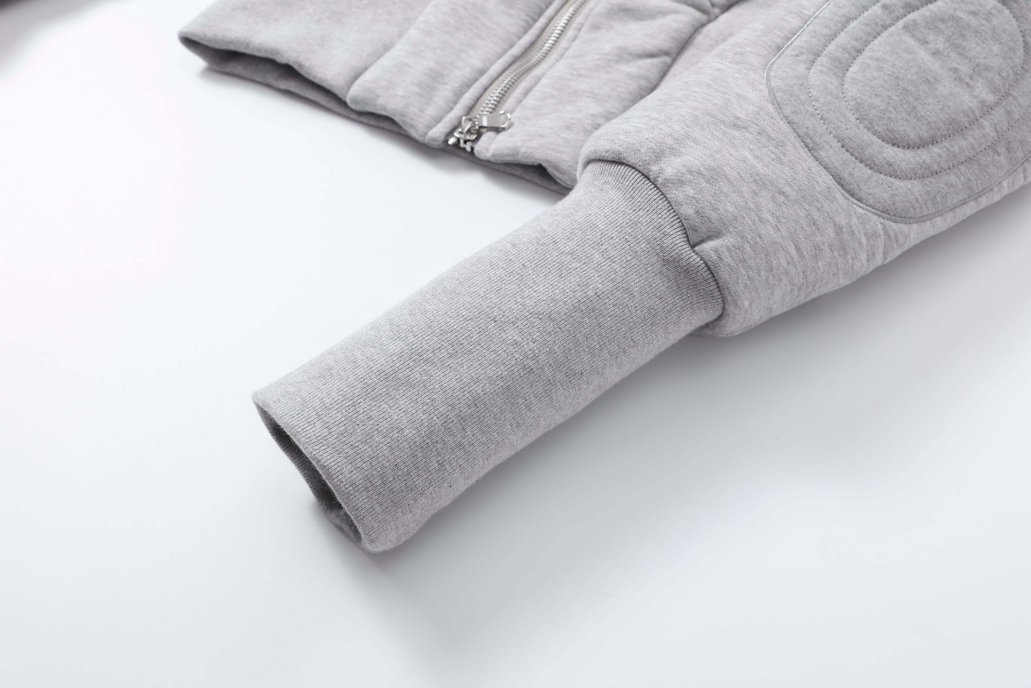 このジッパージャケットは、立体的なメガネ形のデザインが特徴で、一目で目を引く存在感があります。グレーの落ち着いた色合いは、カジュアルなスタイルにも合わせやすく、デイリーユースにも最適なアイテムです。さらなるデザイン性とリラックス感を兼ね備えた一着です!
