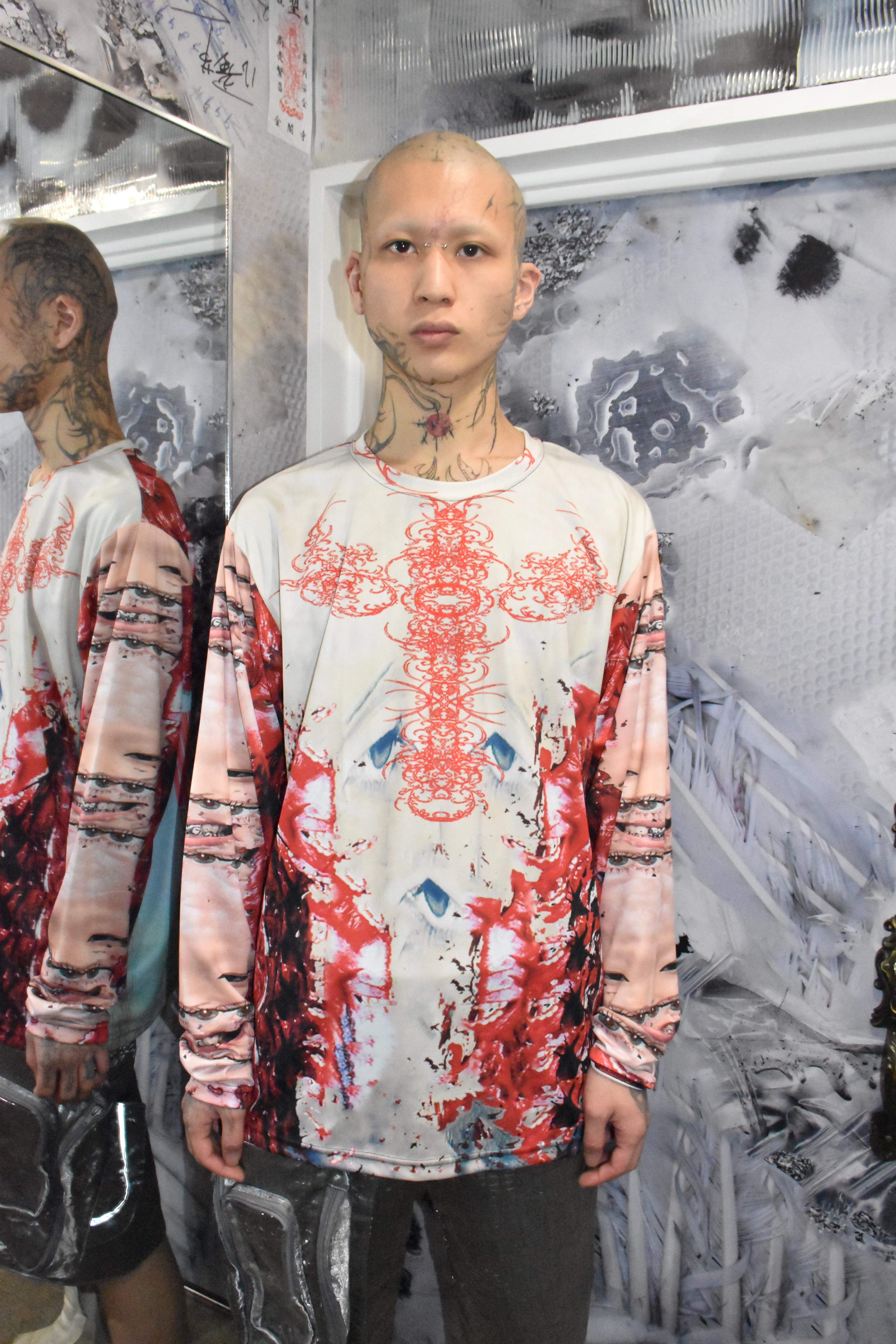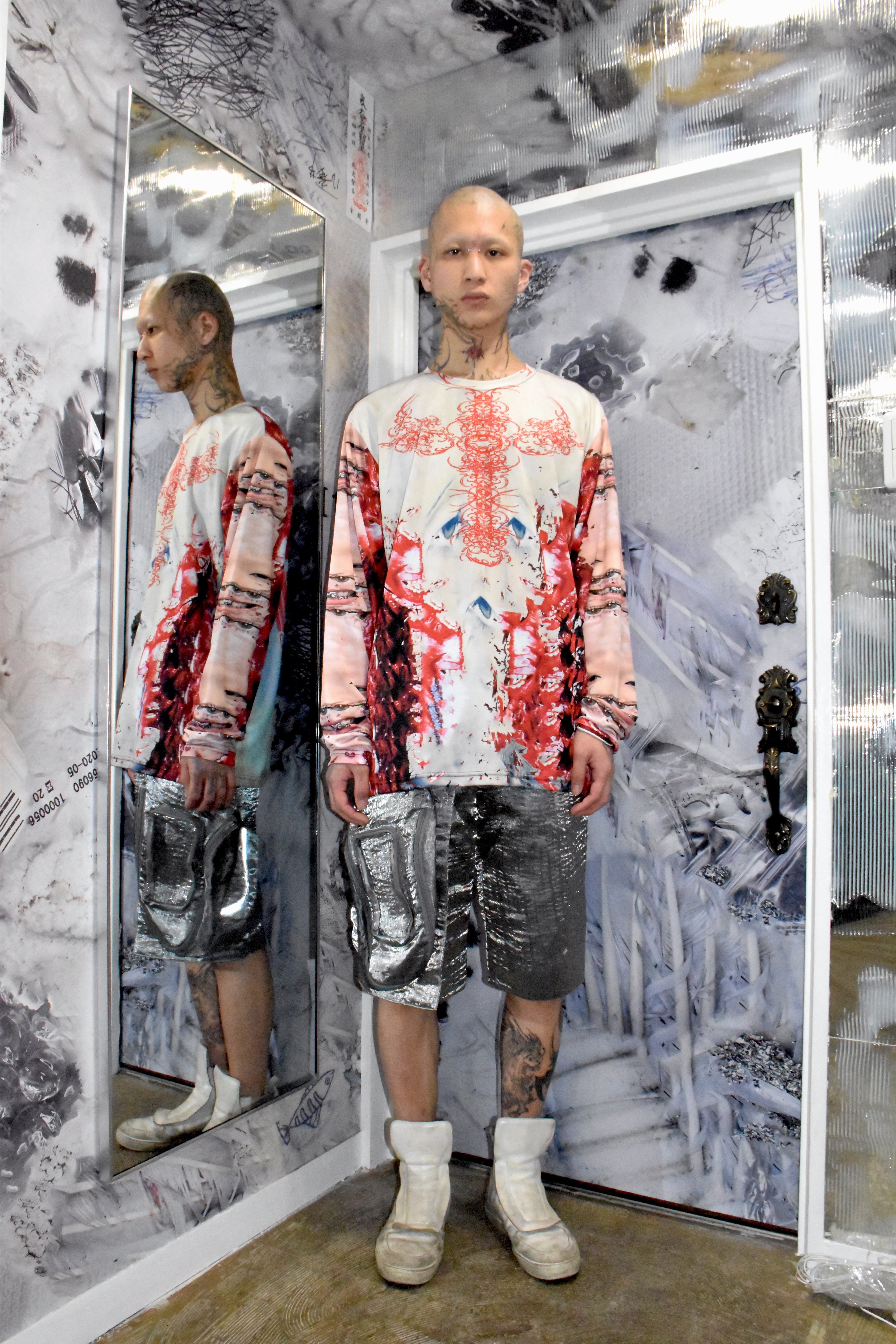 Killhous3はロンドンで生まれたブランド。デザイナーはインド人です。崩壊の中で生まれた反応であり、偶然から持続へと変化した存在。服を通じて内面と外界の境界を解体し、個の独立と接続を提示する。死・再生・生の循環を内包し、暗闇の中でも消えない意志を可視化する。