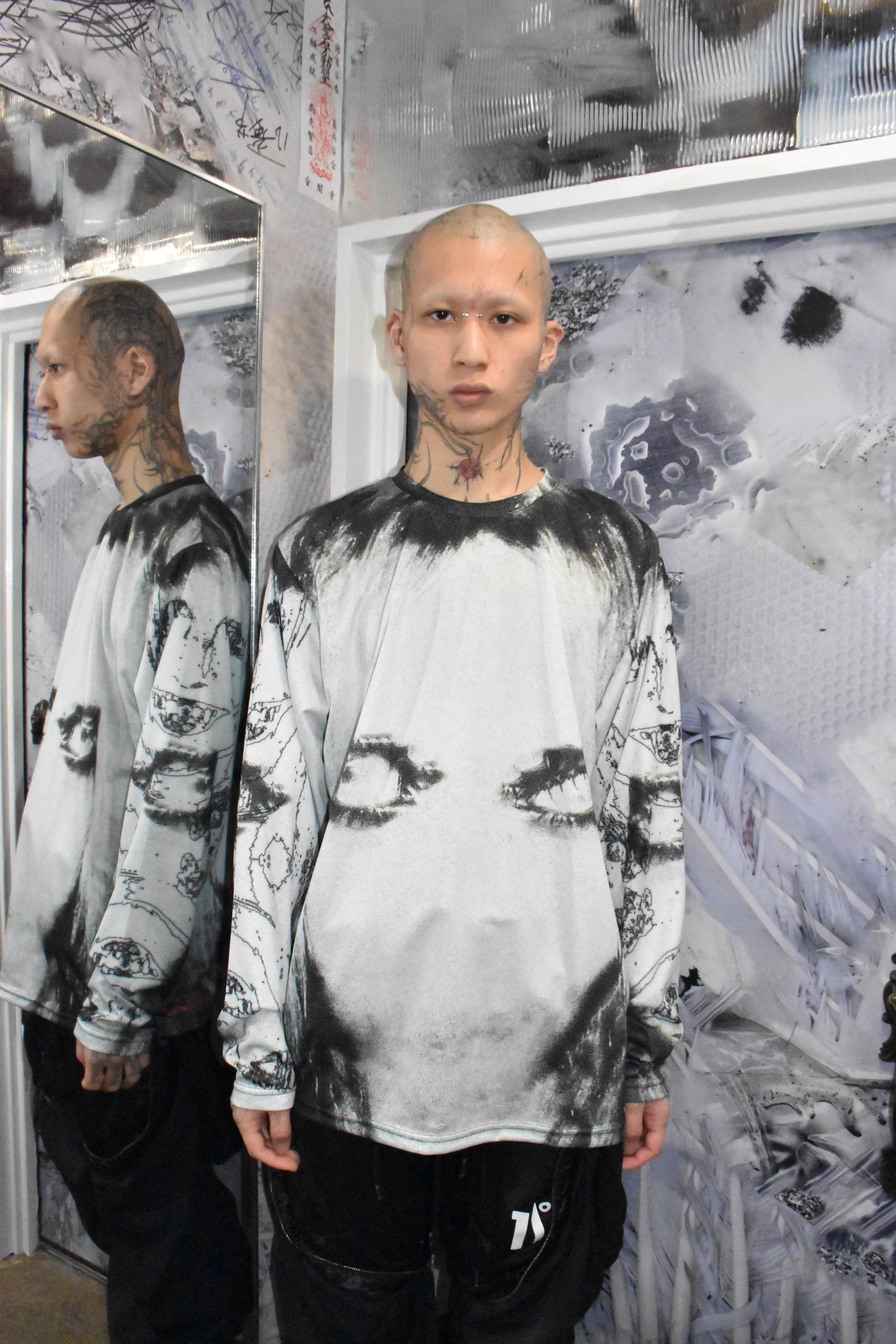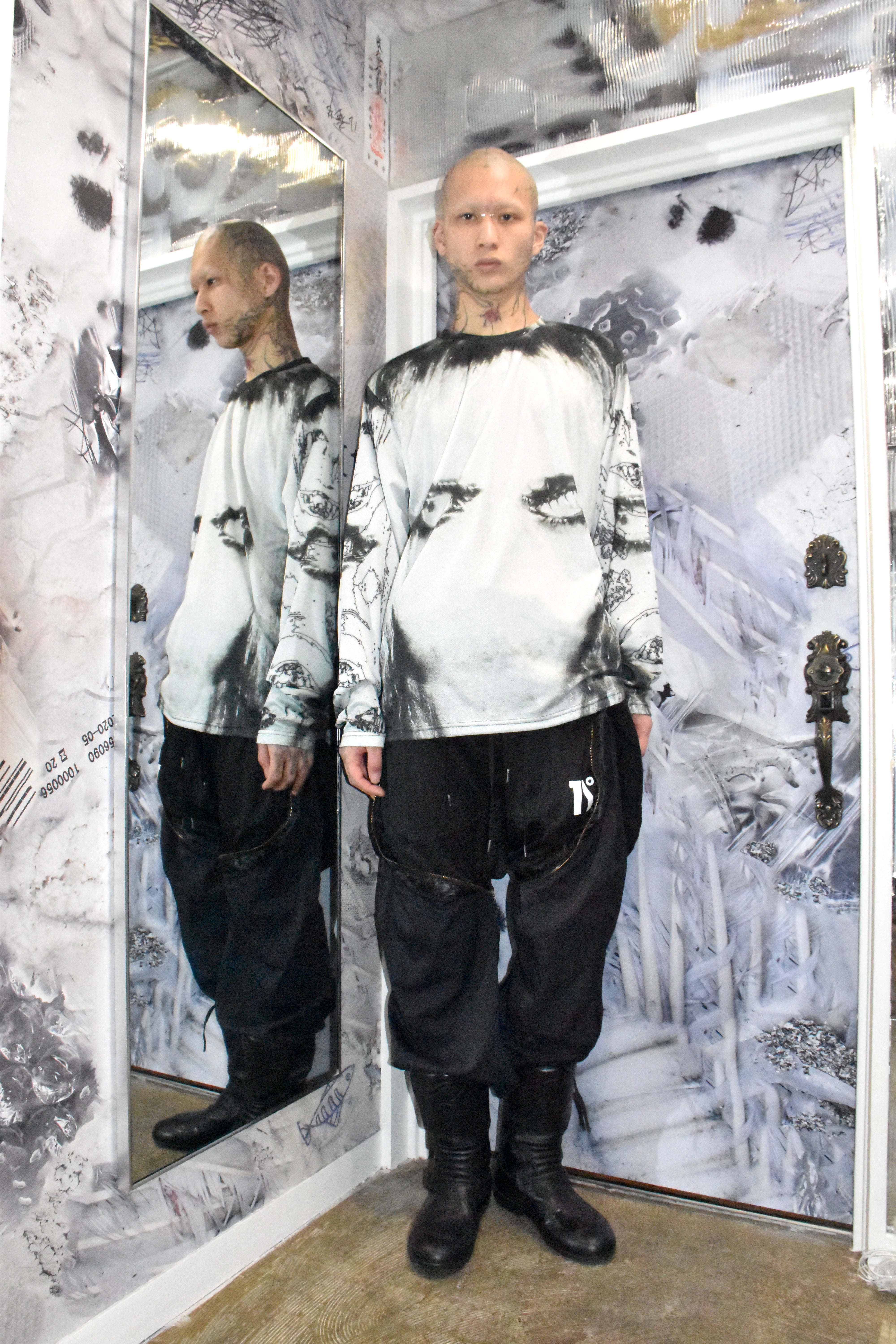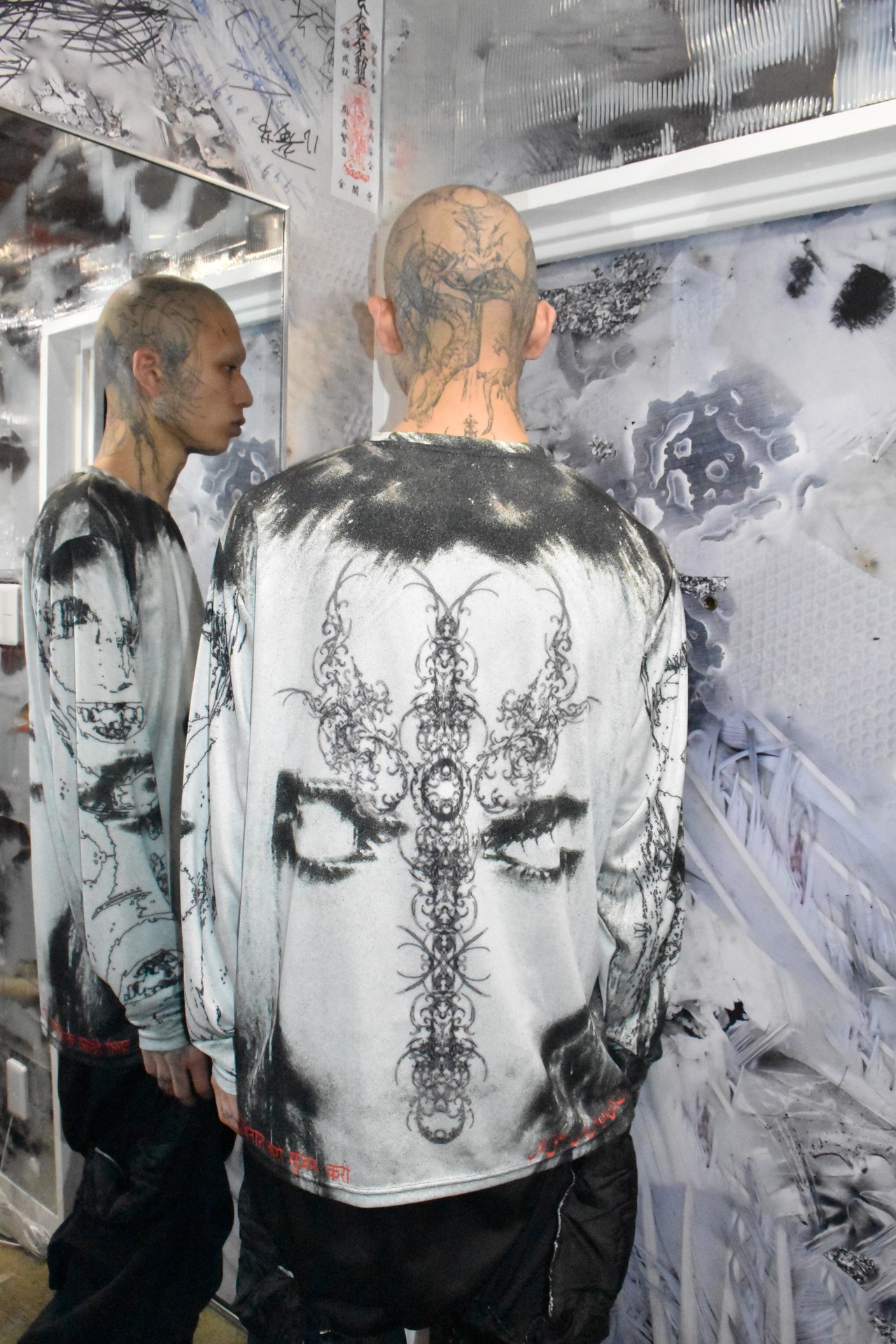 Killhous3はロンドンで生まれたブランド。デザイナーはインド人です。崩壊の中で生まれた反応であり、偶然から持続へと変化した存在。服を通じて内面と外界の境界を解体し、個の独立と接続を提示する。死・再生・生の循環を内包し、暗闇の中でも消えない意志を可視化する。