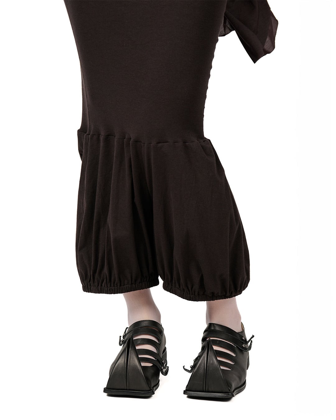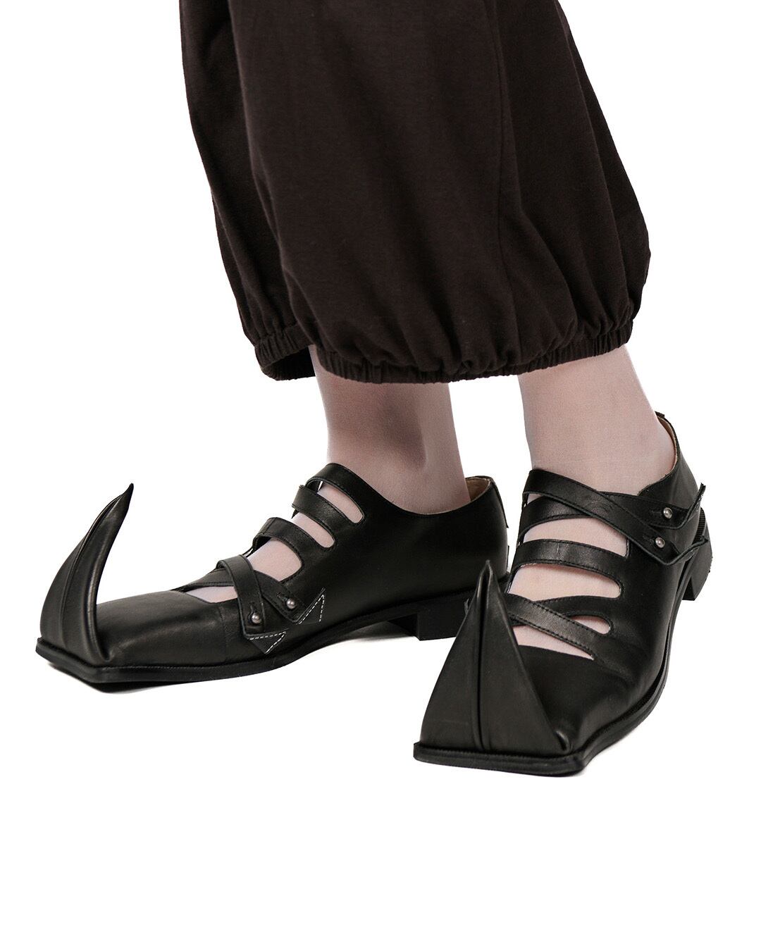 Fey Fey Worldwideの最初の靴のデザインは今回のコレクションでデビューしました。魔女の必需品であるフォールドプーレーヌは多用途性を提供し、ポインテッドトゥとスクエアトゥのスタイルを簡単に切り替えることができます。 噂によると、この機能はLibraの設計者が決断できなかったため生まれたそうです?! ストラップの端には魅力的な小さなフリップが付いており、さまざまな創造的な方法で結ぶことができます。フォールドプーレーヌは、ブラック カーフスキンのアッパーに、オフホワイトのシープスキンの裏地と耐久性のあるラバー ソールを備えています。