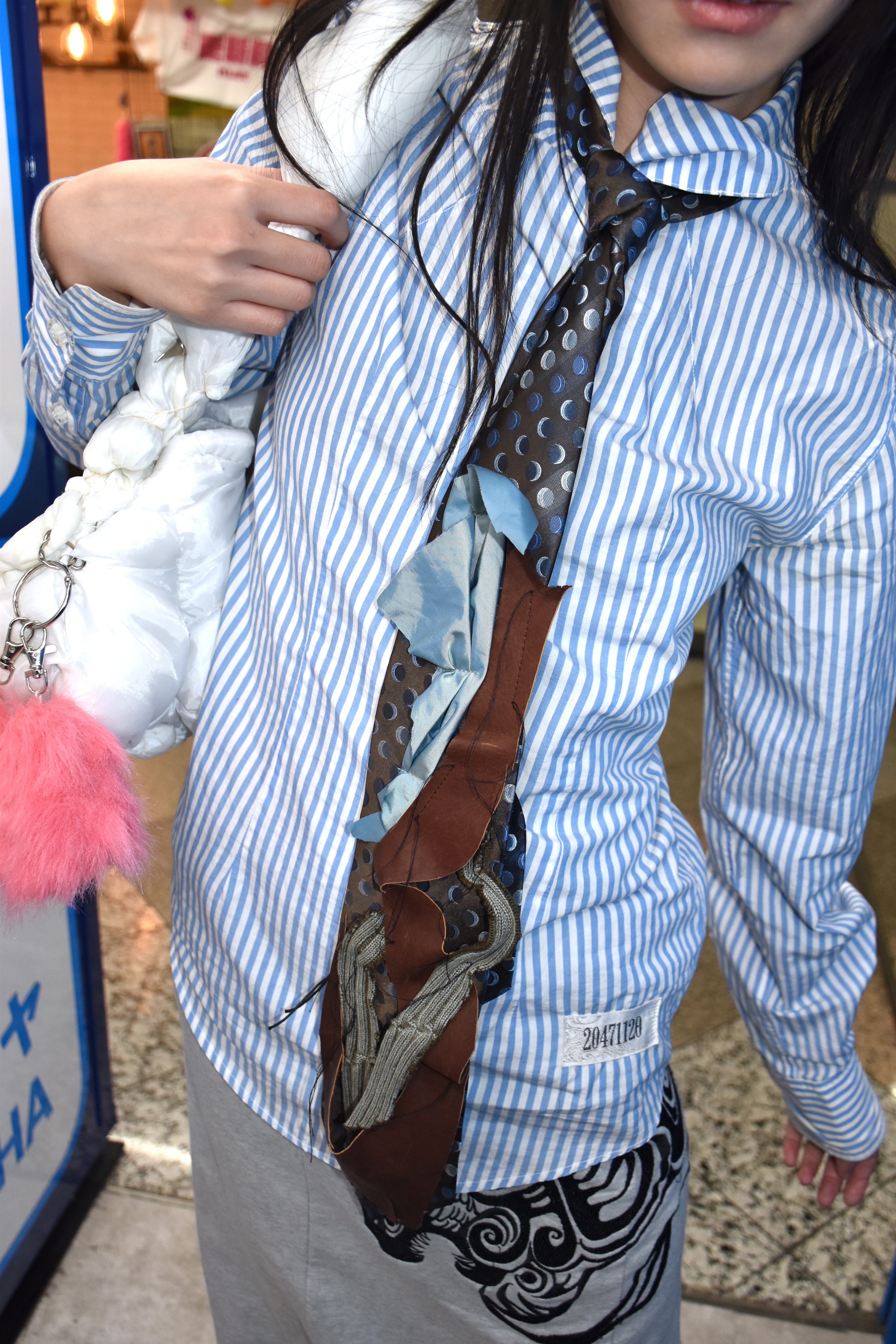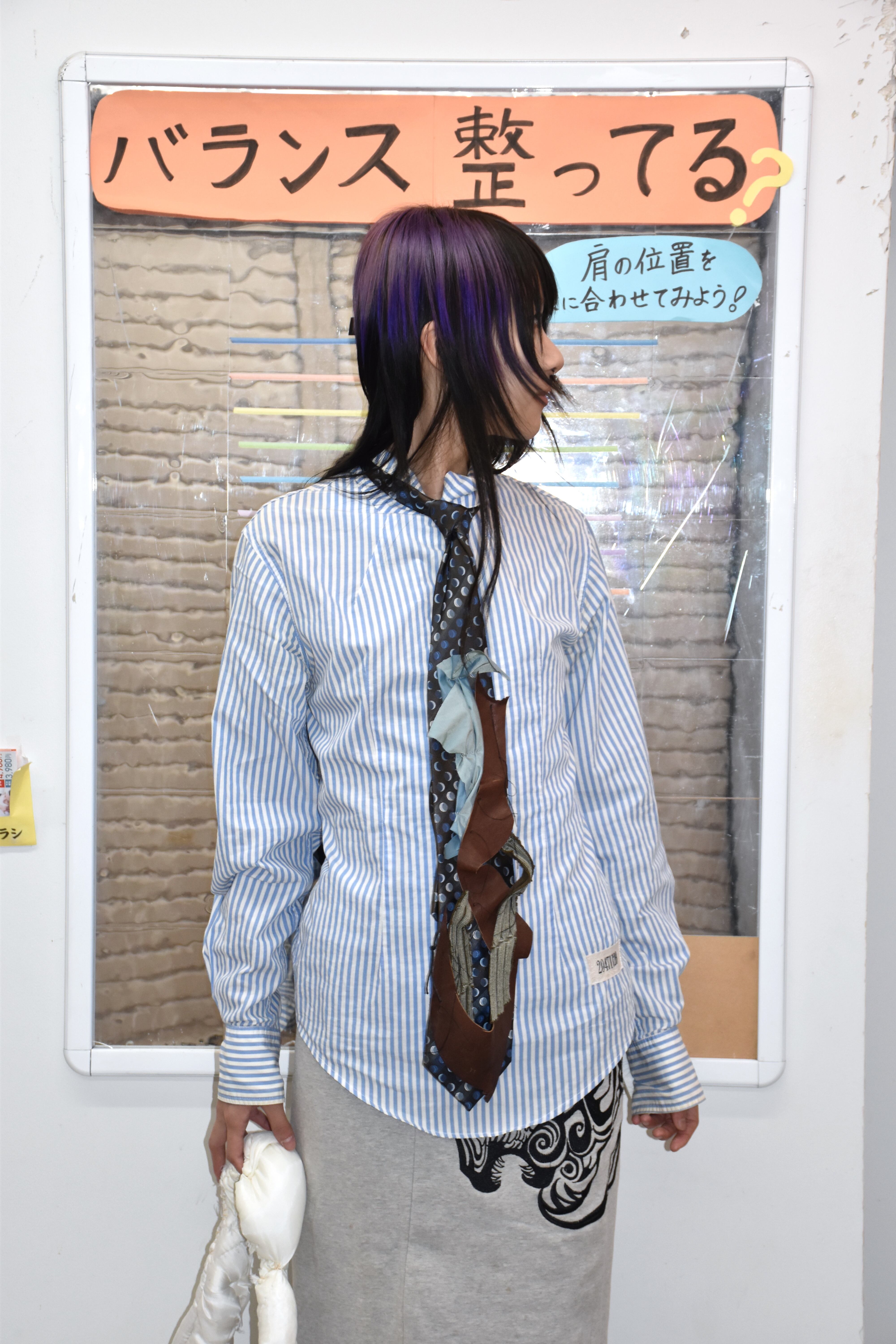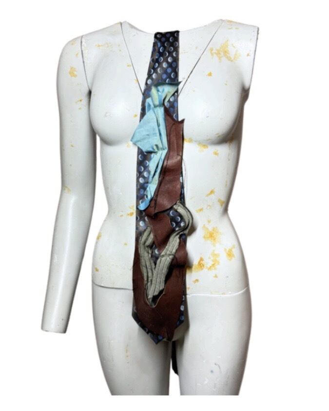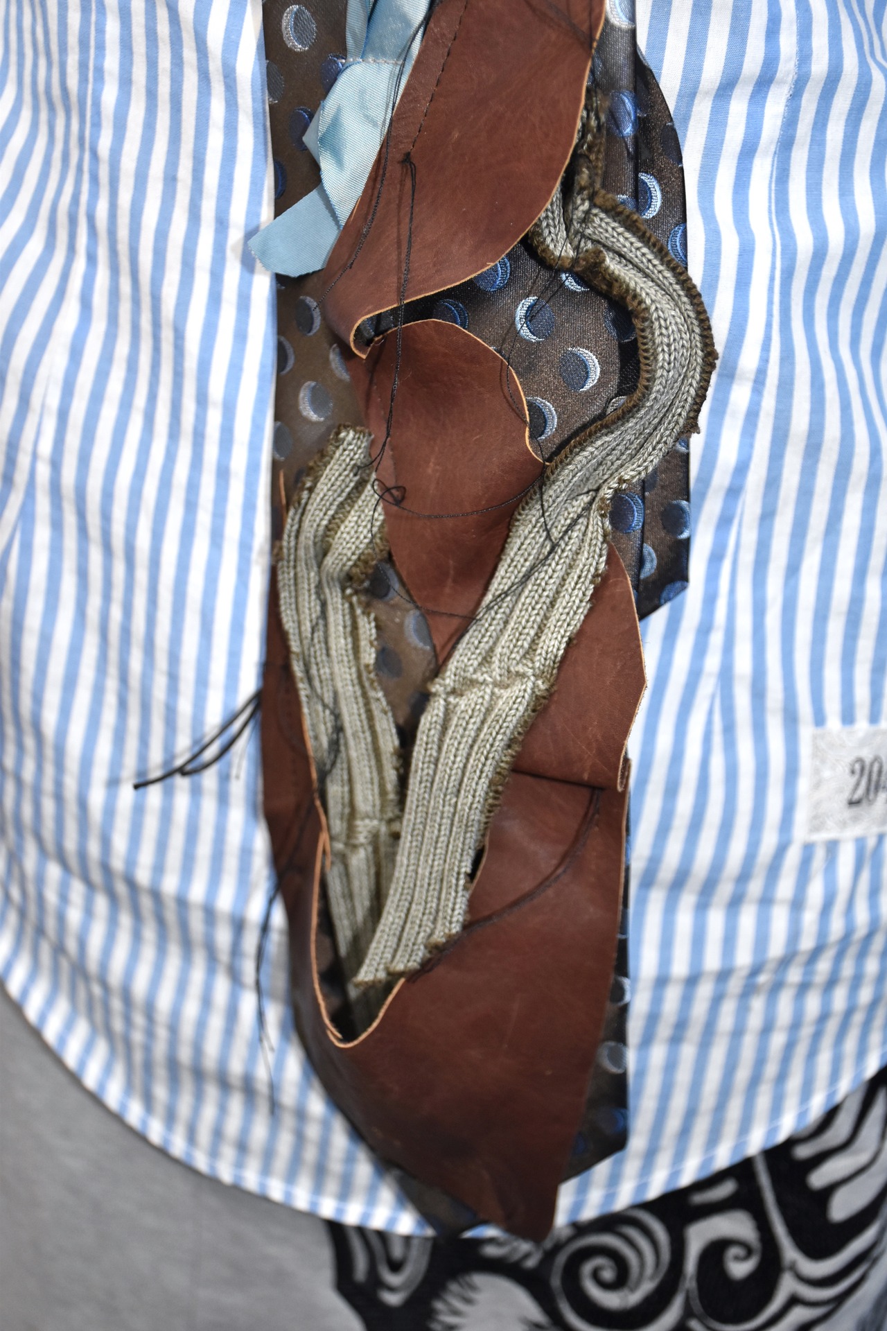 今回のネックタイは、リサイクル素材を巧みに組み合わせたエレガントなデザインが特徴です。深い青色とウォームブラウンの絶妙なコントラストが魅力で、一点ものならではの個性的なスタイルを演出します。どんなシーンにもマッチし、特別な日だけでなく、普段使いでも重宝するアイテムです。